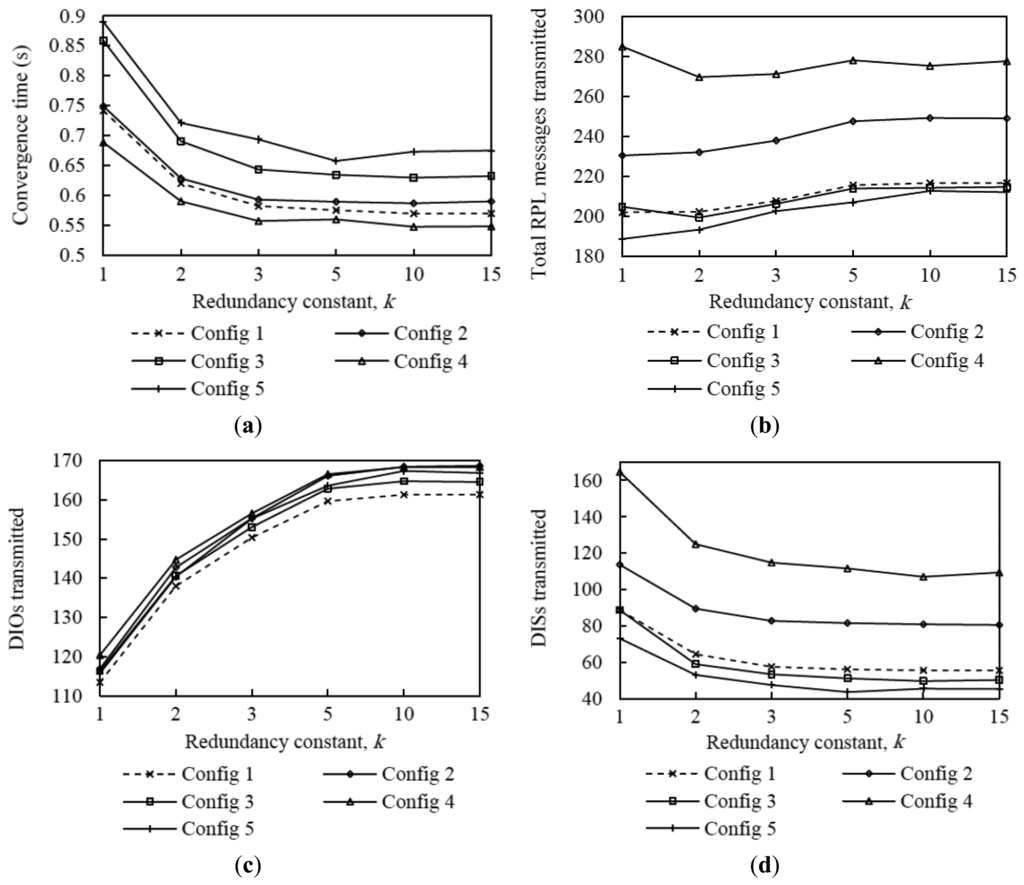 From the results shown in Figures 4, 5, 6, 7, 8 – 9, it can be concluded that there is a tradeoff between network convergence time (and node join time) and the number of DIO messages sent, which depends on the redundancy constant. In order to achieve a low network convergence time, the redundancy constant should be set to a value equal or close to the average node degree. Greater redundancy constant values might cause an unnecessary increase in the number of DIO messages transmitted and collisions in very dense areas of a network, which however would not yield a network convergence time decrease. The influence of the redundancy constant grows with both the network density and size.