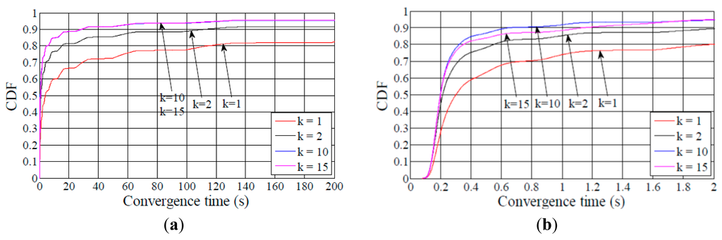 Figures 5, 6 – 7 show the Cumulative Distribution Function (CDF) of the network convergence time for all the network size and density scenarios considered. The results illustrated by these figures evidence the dramatic impact of the redundancy constant on network convergence time. Increasing the redundancy constant value causes the percentage of DODAGs formed in a given time to increase as well. For example, in the medium network scenario, when the node degree is 5 (Figure 6a), and k is equal to 1, more than 80% of the DODAGs are formed in less than 120 s, while the same ratio of DODAGs are formed in less than 18 s for k ≥ 2. As the network density grows, network convergence times decrease as well. Still in the medium network scenario, when the node degree is 10 (Figure 6b), and k is set to 1, 80% of the DODAGs are formed in less than 2 s, whereas the same ratio of DODAGs are formed in less than 0.6 s for k ≥ 2. In the same scenario, for a node degree of 15 (Figure 6c), 90% of the DODAGs are formed for any value of k in less than 0.6 s.