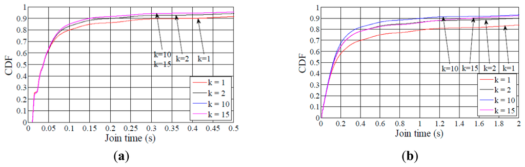 As shown in Figures 5, 6, 7 – 8, the difference between the curves for k = 1 and for k = 2 is greater than the difference between the curve for k = 2 and any curve for k > 2. This result illustrates that the network convergence time and join time improvement that can be achieved by increasing the redundancy constant decreases as the redundancy constant grows.