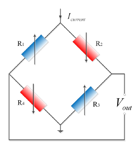 The piezoresistive pressure sensor design is based on piezoresistive effects which can convert physical signal into electrical signal. Generally, the piezoresistive pressure sensor consists of four piezoresistors (R1 = R2 = R3 = R4 = R) placed on the stress concentration regions in a Wheatstone bridge configuration. The equivalent circuit model of the pressure sensor is shown in Figure 1.