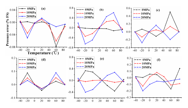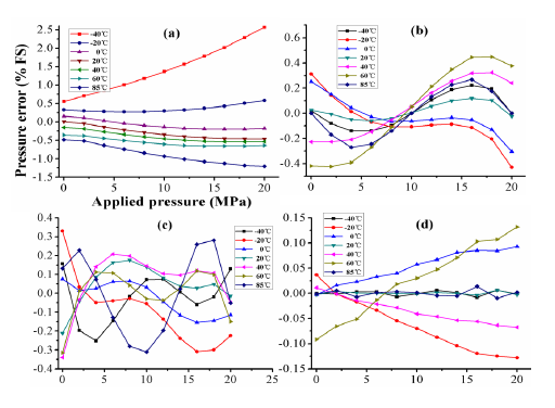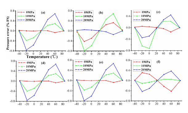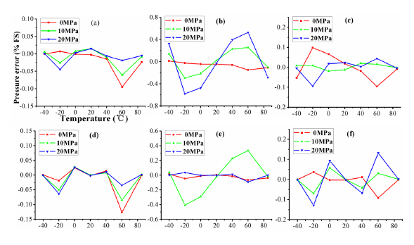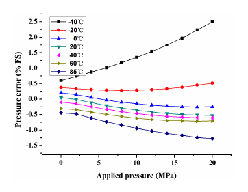 In order to improve the sensor's accuracy, the static pressure was measured within a pressure range of 0 ∼ 20 MPa with a 2 MPa step within a temperature range of −40 ∼ 85 °C with a 20 °C step. The experimental data is fitted using the least square method. The pressure error in percentage between linear fit and actual data is shown in Figure 8, which shows a poor linearity of 2.5% FS which is mainly caused by the thermal drift.