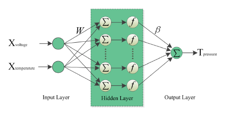 Almost all pressure sensors based on silicon have linearity errors and temperature drift due to the physical properties of silicon. ANN not only can be used to reduce the influence of temperature, but also compensate the zero drift and linearity errors. The single hidden layer feed forward neural network (SLFN) which can approximate any continuous function in theory is currently one of the widely used network structures. A relatively novel learning algorithm called ELM [17] for SLFN (see Figure 2) is selected as the temperature compensation algorithm.