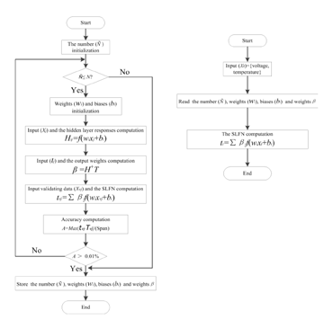 In the compensation process, the required number of hidden nodes can be determined by the flowchart of Figure 3a according to Theorem 2.2 in [17]. ELM learns faster with a higher generalization and operability than the traditional learning algorithms for SLFN such as gradient-based learning methods. In order to evaluate the effectiveness of ELM, other methods such as BP, radius basis function (RBF) neural network, support vector machine (SVM) [18], variable coefficient regression (VCR) [19] and the rational polynomial approximation algorithm (RPA) are selected to compare with ELM.