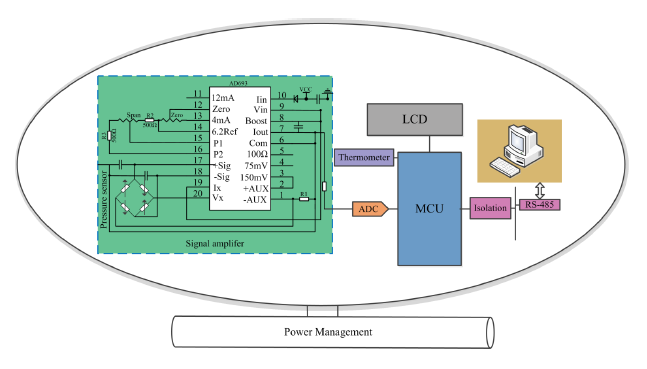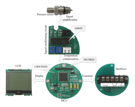 In the circuit, the AD693 is selected as the front-end amplifier to replace the traditional discrete designs, which provide excitation current and output current signals of 4 ∼ 20 mA for pressure sensor. Compared with the traditional amplification circuit design, the AD693 can make the design of signal conditioning easier. Its applied circuit diagram with 0 ∼ 30 mV unipolar input and 4 ∼ 20 mA output is shown in Figure 4. DS18B20 is selected as the digital thermometer. A C8051F020 chip developed by Silicon Lab (Austin, Texas, US) is selected as controller which is generally more than 10 times as fast as the 80C51 series in instruction execution speed, and integrates an analog-to-digital-converter (ADC) and digital-to-analog-converter (DAC). It has a peak throughput of 25 MIPS and 12-bit ADC with the power consumption of about 4 mW. These advantages meet the requirement of high accuracy and simplify the circuit at the same time. The RS485 interface circuit can output digital signal and communicate with a personal computer (PC). Figure 5 shows the system hardware.