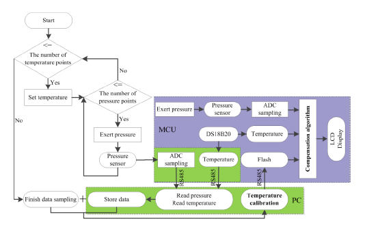 LabVIEW 9.0 is used to design graphical user interface (GUI) of temperature compensation system and write digital data generated by calibration into the microcontroller via a USB-RS485 communication adapter. Figure 6 shows the flowchart of the pressure measurement system. The PC is used for temperature calibration, that is, determination of the number of hidden nodes and the output weights of SLFN trained by ELM. Then the trained SLFN is ported to the MCU. The MCU acquires the object pressure and ambient temperature, and calculates the compensated pressure using the ported SLFN. Finally, all the measured information is displayed on the LCD.
