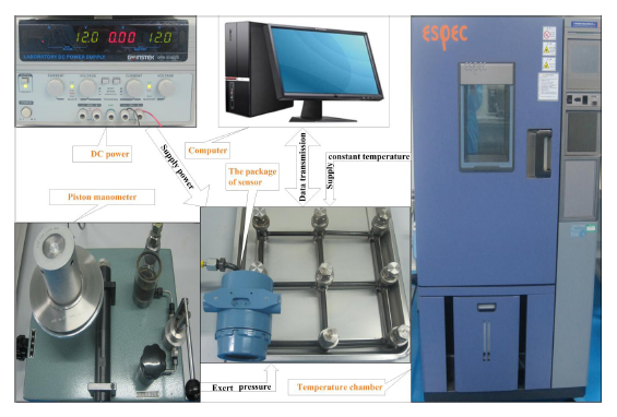 The experiment process of temperature compensation is shown in Figure 7, which comprises 24 V DC power, temperature test chamber and piston manometer. First, the system hardware is put into a temperature test chamber. The temperature test chamber is used to apply the specified temperature to the pressure sensor and keep the temperature stabilized for one hour. Then the piston manometer exerts different pressures on the pressure sensor according to the experiments. The computer is operated manually to read the pressure and temperature data from the MCU in a wired communication way when each pressure point exerted is stable. At last, the trained SLFN for temperature compensation is ported to the MCU after temperature calibration in the PC.