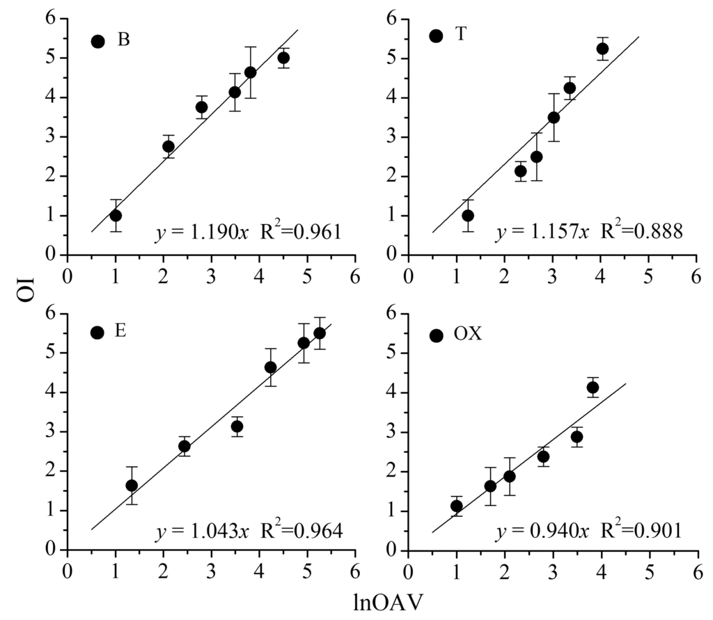 As shown in Figure 1, a significant linear relation is found between OI and lnOAV (natural logarithm of odor activity value). Each point on the figure indicates an odor sample, and the corresponding OI is the average of ten measured scores (ten assessors in panel A). The linear regression equations and R2 values are also provided. The OAV is a ratio between an odorant's chemical concentration and its odor threshold (i.e., OAV = C/CThr.). Because odor threshold is normally used as a constant, OAV can be directly calculated from the measured chemical concentration. Thus, OAV is indirectly on behalf of the chemical concentration and lnOAV just is its mathematical transformation. Based on the similarity between n and lnOAV, n in the above Equations (1) and (2) was considered to be displaced by lnOAV.