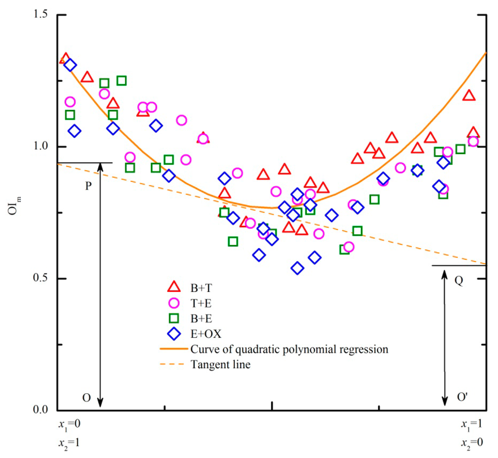 Except for analyzing the odor interaction, the PDE model also can be used for OI prediction. As shown in Figure 2, the OIm displays a tight relation with components' mixing ratio. Each point on the fitting curve corresponds to a binary odor sample with corresponding proportion on the horizontal axis. If the odor concentrations of two components have been measured, OI of a binary odor sample can be predicted through calculation on the basis of corresponding PDE model. For example, an odor sample of mixture B+T has the mixing ratio of 0.6 (lnOAVB = 3.36 and lnOAVT = 2.24). According to the regression equation (Figure 2a, y = 1.93x2 − 2.09x + 1.39), the location of this sample is (0.6, 0.83). Plotting a tangent line at the point on the regression curve, the corresponding equation of the tangent line is y = 0.23x + 0.72 (Equation (3)). According to Equations (8) and (9), its intercepts on the two vertical axis (x = 0 and x = 1) are the corresponding OIB,m = 0.95 and OIT,m = 0.72. Based on the summation formula of partial molar volume: