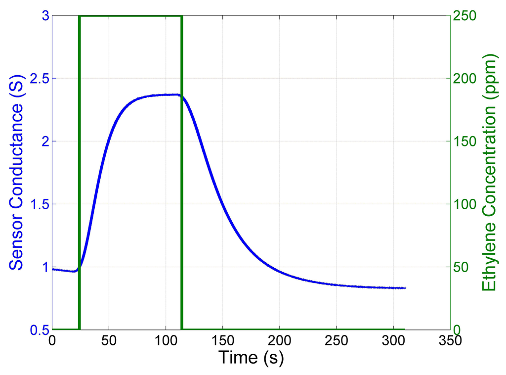 One of the main drawbacks of MOX sensors for open sampling applications are the slow response time and the even slower recovery time. Figure 1 shows the response time and recovery time in a closed sampling system without disturbances like turbulence and advection of the airflow. The MOX sensor was exposed to a pulse of Ethylene and the sudden variation in the exposure of the sensor generates exponential-like responses. Those exponentials have different time constants depending on whether the conductance of the sensor increases (faster) or decreases (slower).