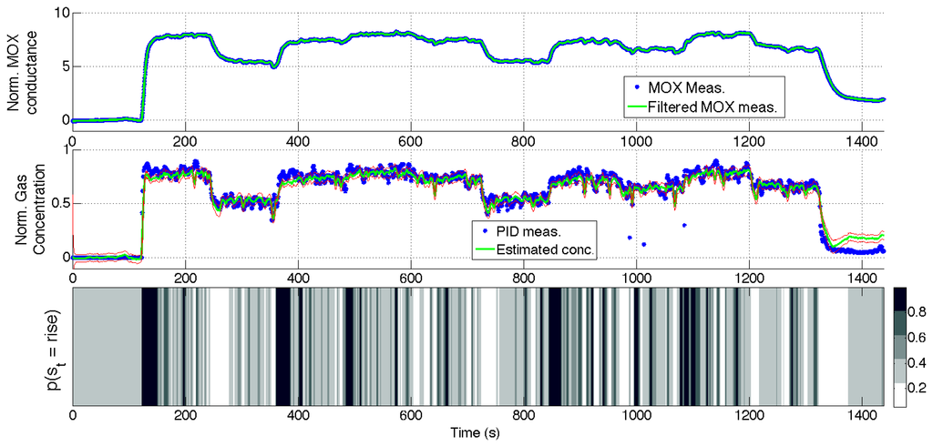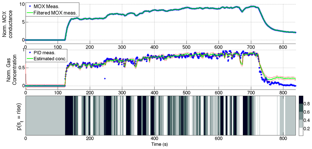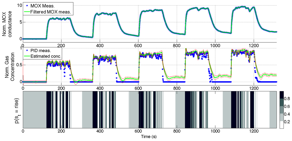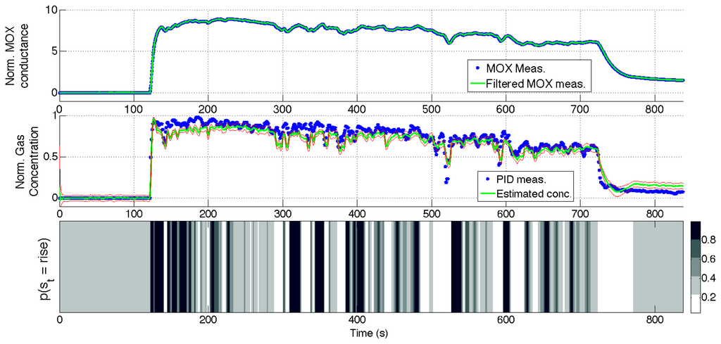 In Section 4, we have shown how the aSLDS allows, given a time-series, to estimate the probability distribution of a set of possible dynamical models being active at each point in time as well as the corresponding unobservable input sequence. In this section, we present the results of the aSLDS approach to gas concentration estimation using MOX sensors. In our application, the dynamical models are given by the 8 MOX sensors, each one exhibiting different dynamical properties for each phase, and the unobserved input to be estimated is the underlying gas concentration. First, we use the data collected from a subset of the experiments described in Section 4 to learn the dynamical parameters of our sensor array, using the PID measurement and the known gas emission sequence of the odor blender as ground truth for the real gas concentration and the sensor current phase, respectively. Then, we apply the aSLDS to estimate on-line the gas concentration using only the MOX sensors measurements for the set of experiment not used during learning. The algorithmic complexity of the our approach is O(512) for each sample of each sensor. In our MATLAB implementation (running on a standard laptop), it takes 539 s. to process an experiment with a duration of 1437 s. Therefore an on-board, real-time implementation is feasible.