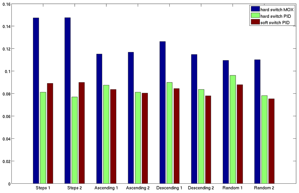The bar graph in Figure 14 display the average NRMS error for each validation experiment, for the three aforementioned models. The re-scaled MOX measurements, as expected, lead to the biggest NRMS error. The hard switching model achieves a smaller error for the datasets Steps, because a faster switching model performs better than the soft switching one in correspondence of big jumps in gas concentration (like shown in Figure 9) but is, in general, penalized in the other cases, because the estimated derivative ẋs (which is, in this model, the only responsible for driving switches in the sensor phase) is more sensitive to oscillations and noise in the MOX measurements.