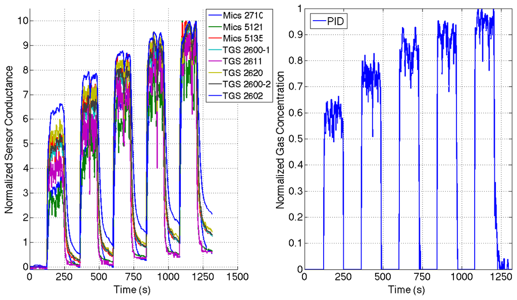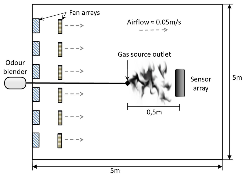 Experiments were carried out with static sensors in a 5 × 5 × 2 m3 closed room in which an artificial airflow of approximately 0.05 m/s was induced, see Figure 2. The airflow is created using two arrays of four fans, one placed on the floor and one on the wall. The gas source is an odor blender, a device developed by Nakamoto et al. [28], which allows fast switches in between different mixtures of compounds with a variable concentration. The outlet of the odor blender is placed on the floor 0.5 m upwind with respect to an array of eight commercial metal oxide gas sensors from Figaro Engineering [29] (TGS2600 × 2, TGS2602, TGS2611, TGS2620 ) and e2v Technologies [30] (MiCS2710, MiCS5121, MiCS5135). The selected sensors have overlapping sensitivity and they respond to a wide range of target compounds. The airflow at the outlet of the odor blender is set to 1 L/min. The sensors sampling rate is 4 Hz. A Photo-Ionization Detector (PID) sensor is also used, mounted next to the MOX array, slightly downwind.