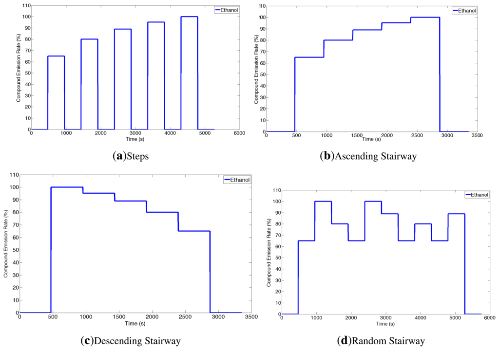 The analyte selected for these experiments is ethanol. In order to create a database that allows to study the dynamic behavior of the sensors when consecutively exposed to different analytes, four different odor emitting profiles have been applied. For all these profiles, the gas source emits clean air for two minutes and the signal of sensors during this period is assumed as a baseline. At the end of all the experiments, the source emits again clean air for 2 min. Figure 3 shows the intensity profile for the gas source in the various emitting profiles. A total of 54 experimental runs have been performed. The concentration of analyte released varies from 35 to 200 ppm.
