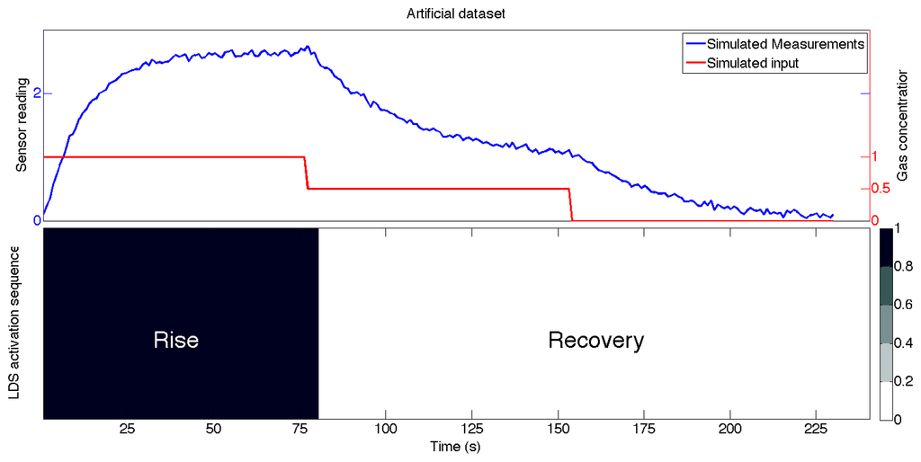 As a toy example to explain the system identification and later the aSLDS inference, an artificial dataset was generated as follows. First, two first-order LDS as in Equation (1) with different values of τ and b were defined. We then simulated the time-response of the sensor model to a sequence of step inputs of variable amplitude. The rise time-constant is used when the input increases with respect to the previous value, while the recovery model is used in the other case otherwise. Gaussian noise is added to the state to simulate measurement noise. We define rise and recovery phases according to the input, not the sensor output. We consider the sensor to be in rise phase for as long as the input at time t is not smaller than the one at time t – 1, and in recovery phase as long as the input at time t is not bigger than the previous one. This is because the two LDS are distinguishable only from their transient response, so for our application there is no advantage in specifically modeling the steady-state phases. The generated dataset is shown in Figure 4.
