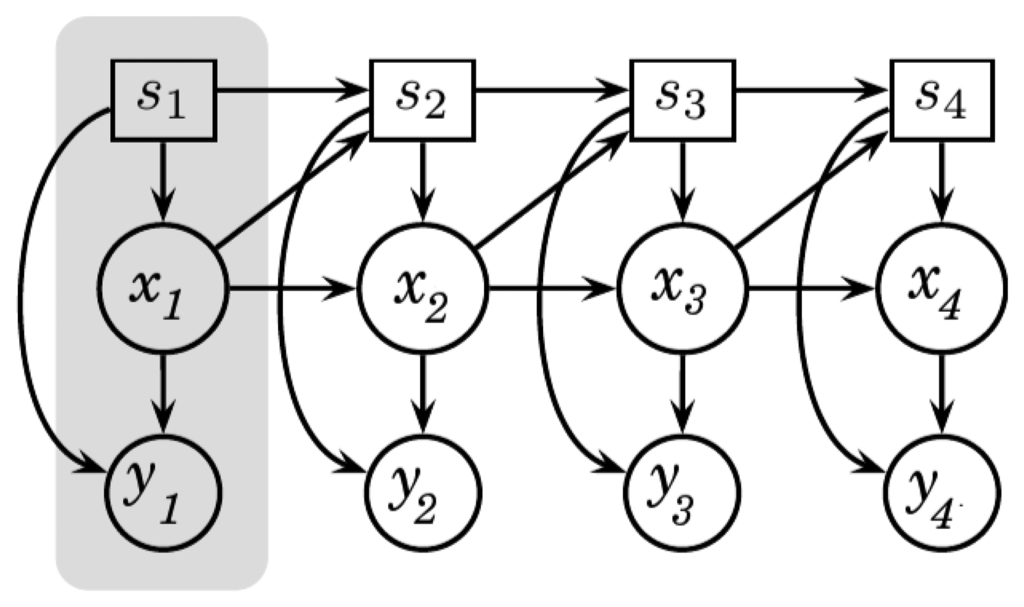 p(x1|s1) is the prior probability of the state given the initial switch state. It is a conditional Gaussian distribution, and its only role is to initialize the inference routine.It requires the definition of two additional parameters, namely the prior mean x̄(s1) and the prior covariance P(s1):
