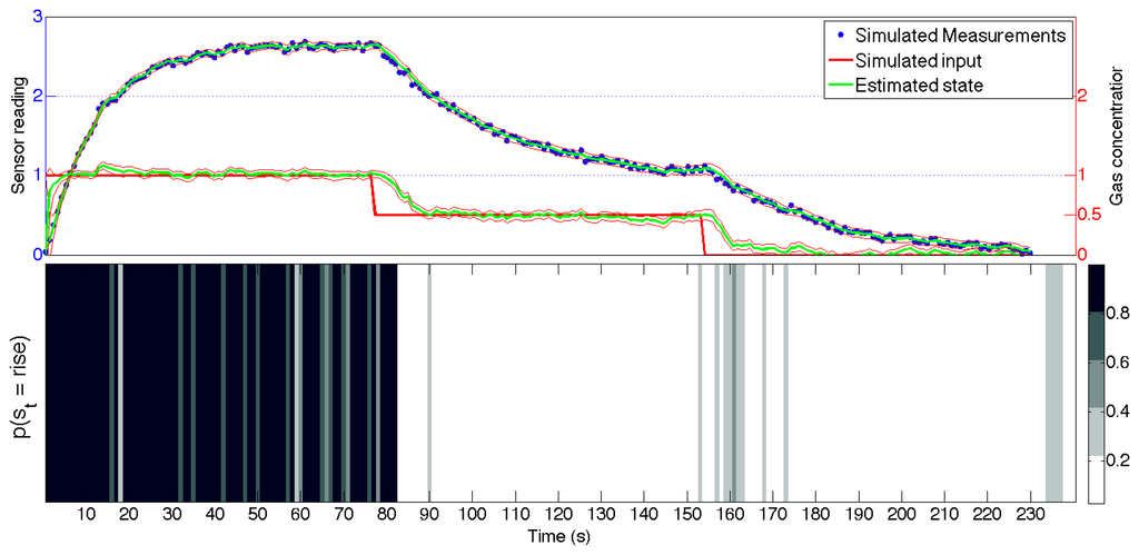 At the bottom of Figure 7, the probability distribution of the switch variable is represented in grayscale, for visual comparison with the ground truth shown in Figure 4. From this part of the figure, it can be noted that the the probability of a sensor phase is high (or low) where the signal is rapidly changing like, for example between 0 and 15 s or around 85 s. Conversely, when the system is in steady-state, many gray bands can be seen, because the measurements themselves contain little information, but the transition model is biased toward keeping the previous values. The delay introduced by the filter is related to the bandwidth of the filter, which is related to ratio of the process and measurement noise amplitude q and r. The amplitude of q in Equation (9) will also affect the covariance of the estimated state, represented in the figure by the 2 − σ confidence interval plotted around the estimated state variables. The tuning of q and r is a crucial step in the application of the aSLDS model. Guidelines on settings these parameters rely on statistical tests, and can be found in [35].