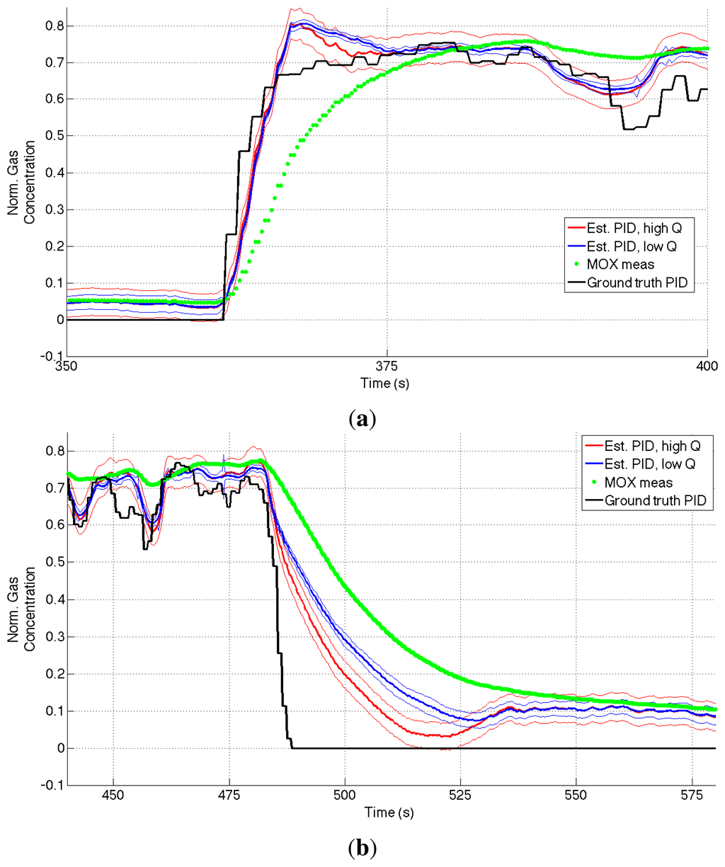 Figure 9 shows the difference between the simple scaled MOX measurements and the gas concentration estimate obtained using the aSLDS model for a portion of the step dataset, using two different values for the parameter q. It can be noted how the aSLDS estimated input follows the PID ground truth much more closely, especially where the gas concentration exhibits sudden changes.