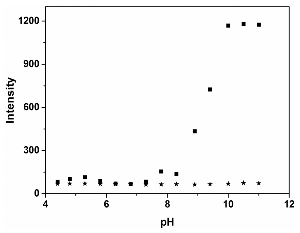 A pH titration experiment was performed first to investigate a suitable pH range for the sensing of probe P to Mg2+. As shown in Figure 1, the emission intensities of the free probe P can be negligible in the range pH 4–11. After the addition of Mg2+ to the solution of probe P in the range of pH 4–11, the emission intensity at 460 nm rapidly increased to a maximum. For pH values smaller than 8.0, the emission intensity was significantly less than that for the high pH values, indicating poor stability of the Mg2+-P complexes at low pH. The pH-control emission measurements revealed that probe P showed the best respond to Mg2+ at pH 10.0. Therefore, further UV-vis and fluorescent studies were carried out in ethanol-water solution (9:1, v:v, 20 mM HEPES, pH 10.0).