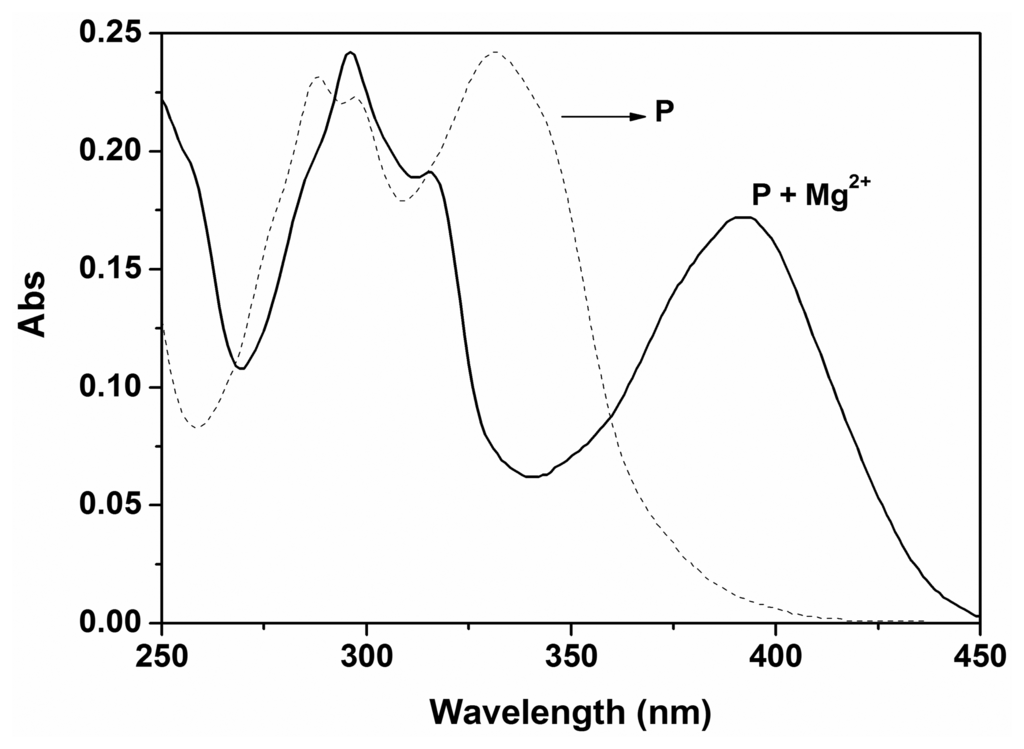 The addition of Mg2+ to the solution of P (10 μM) in ethanol-water solution (9:1, v:v, 20 mM HEPES, pH 10.0) caused an obvious spectra change in the UV region (Figure 2). This result in absorbance clearly suggested the binding of P with Mg2+. The new band at 395 nm suggested that Mg2+ binding with chemosensor P blocks conjugation between the double bonds, resulting in a longer absorption wavelength.