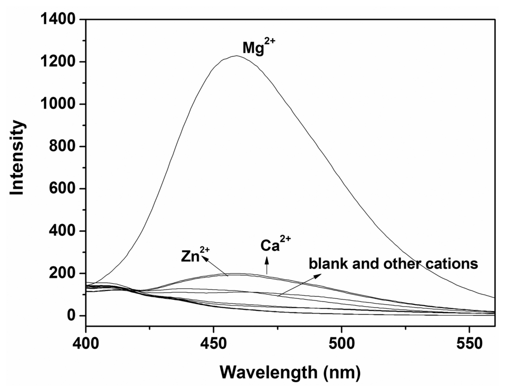 In summary, a simple structure probe was synthesized facilely. This new fluorescent probe showed significant fluorescence enhancement in presence of Mg2+ in ethanol-water solution (9:1, v:v, 20 mM HEPES, pH 10.0). We believe that these observations should serve as the platform to develop new probes for other metal ions.