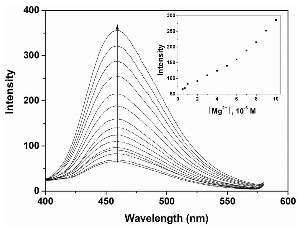 To further investigate the interaction of Mg2+ and P, a fluorescence titration experiment was carried out. The result showed that the fluorescence intensity of P was enhanced upon addition of various amounts of Mg2+ in ethanol-water solution (9:1, v:v, 20 mM HEPES, pH 10.0) as depicted in Figure 5. Under the present conditions, when P was employed at 10 μM level, the fluorescent intensity of P was proportional to the concentration of Mg2+ in the range of 1.3 × 10−6 to 1.0 × 10−5 M with a detection limit of 4.2 × 10−7 M Mg2+. This clearly demonstrated that probe P could sensitively detect environmentally relevant levels of Mg2+.