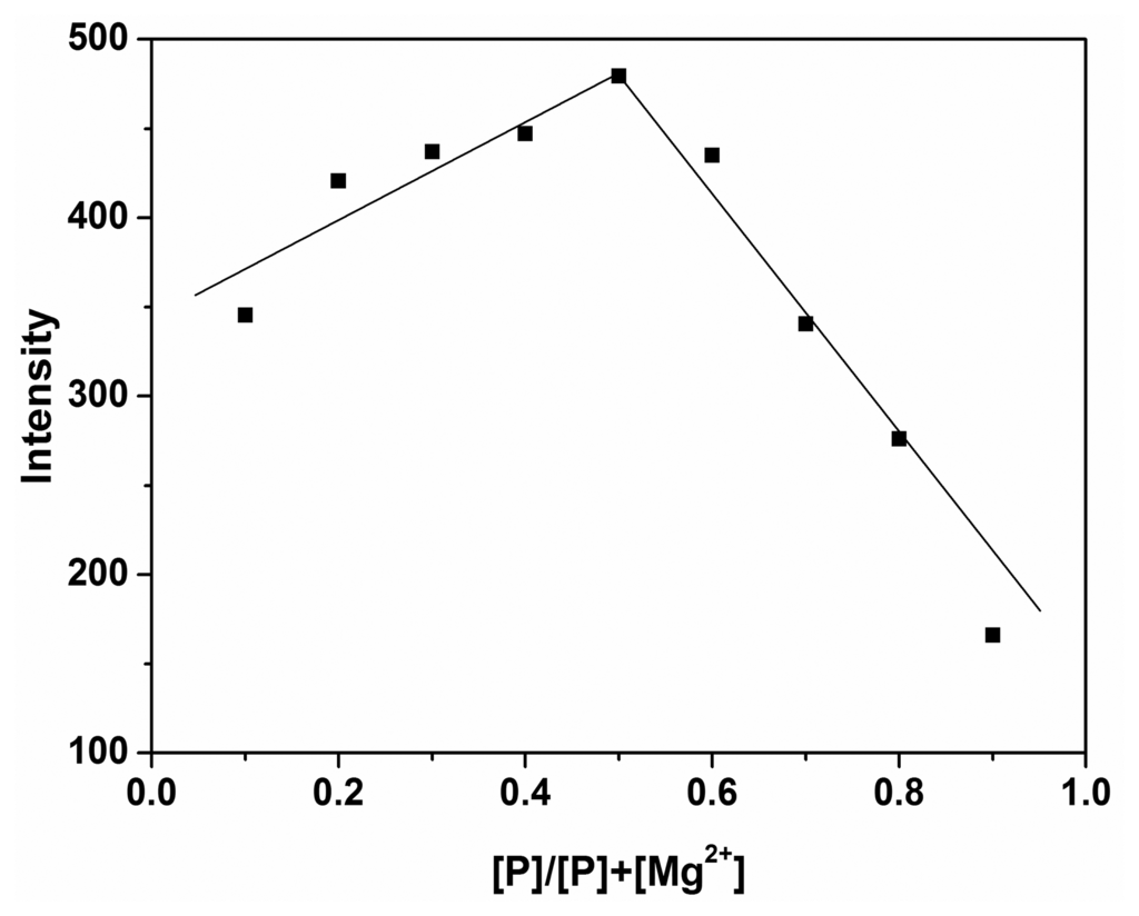 To study the reaction mechanism of P with Mg2+, the Job's plot experiment was carried out, and the result indicated that a P-Mg2+ complex was formed in 1:1 stoichiometry (Figure 6).