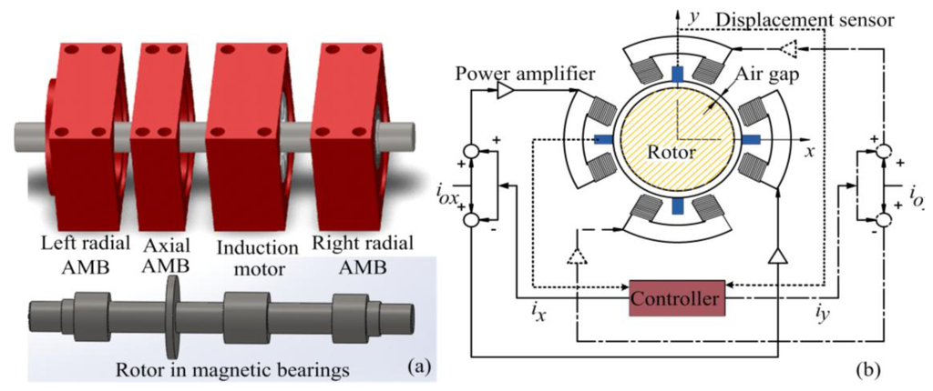 Figure 1a shows the typical structure of a motor drive system, using magnetic bearings, comprising a left radial AMB, right radial AMB, axial AMB, and an induction motor. Each radial magnetic bearing generates radial forces along two perpendicular radial axes. The radial forces are controlled, so that the shaft position is regulated in the center of the stator at the equilibrium position. Figure 1b shows the technical application of the AMB. For motion of the two degrees of freedom, two opposing electromagnets are operated in the differential driving mode [1,2]. In this configuration, the electromagnetic force is exerted on the rotor in arbitrary directions of the x axis and y axis to maintain the rotor in the center. i0x and i0y are bias currents, and ix, iy are control currents along the x and y axes, respectively. Positioning the rotor requires two differential displacement sensors to measure the displacement value following the x and y axes [3]. AMBs suspend a rotor with feedback control through a measured displacement sensor signal. The qualities of a control system depend on the quality of the sensor signal, particularly in precision applications [9].