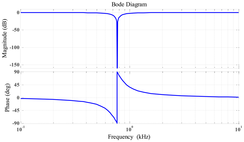 As obvious listed in Table 2, the rotation speed was set at 50,000 rpm higher than the first bending mode at 46,200 rpm or 770 Hz, thus, we used only one notch filter circuit with notch frequency = 770 Hz. The resistor and capacitor values were calculated, and the frequency response for the RLC notch filter is shown in Figure 14.
