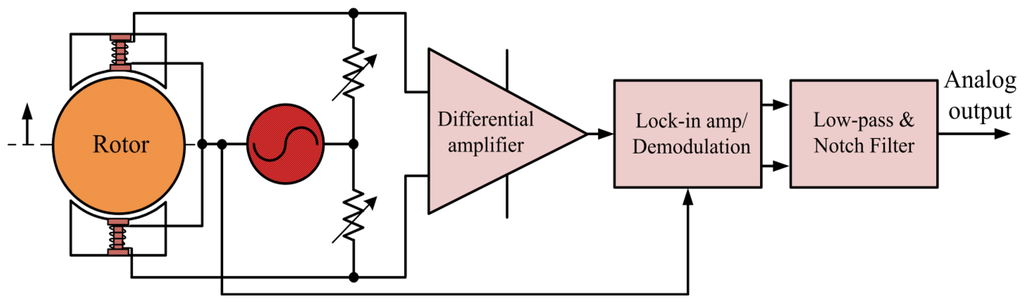 In this study, we implemented inductive displacement sensors using a differential inductive sensor head, lock-in amplifier, and filters. The DC voltage output of the inductive sensor is linearity [7]. Lock-in amplifiers are used to detect and measure a small displacement of the rotor. It uses a technique known as phase-sensitive detection (PSD) to identify a component of the signal at a specific reference frequency and phase. Noise signals whose frequencies differ from the reference frequency are rejected, thus they do not affect the measurement. This technique is called synchronous demodulation [8].