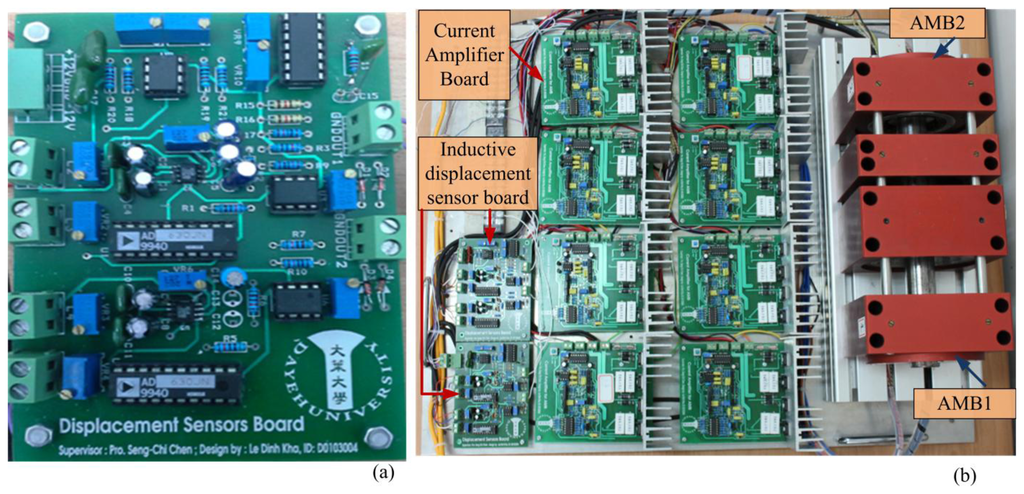 Figure 17a displays the inductive displacement sensor board, and Figure 17b displays the AMB test rig functions. In this board, we used one chip sine wave generator ICL8038 chip and two AD630 chips corresponding to an x displacement sensor and y displacement sensor [14,15].