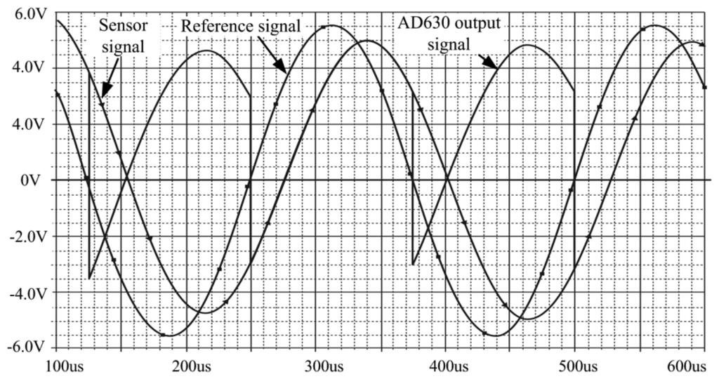 This design was also simulated using the PSpice software. The result is illustrated in Figure 18. The output signal changed follows the phase shift of the reference signal and sensor input signal.