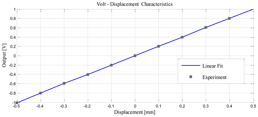 Figure 20 shows that the DC output was linear. We can change the slope output by changing the gain of the active low-pass filter by the way changing the value of R12. Figure 21 illustrates the response frequency of this sensor. The cut-off frequency was 4 kHz, and notch frequency was 770 Hz, The specification results of the differential inductive displacement sensor are summarized in Table 4.
