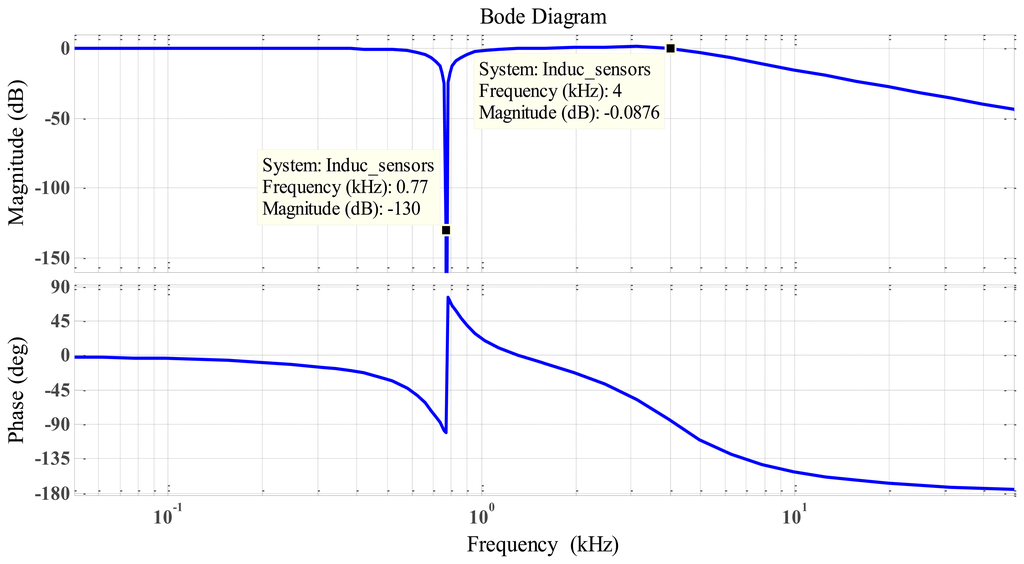 Implementing the inductive displacement sensor with high sensitive, the frequency of AC excitement must be set in range from 5 kHz up to 100 kHz prevent eddy current obstructing the formation of magnetic path on the surface of rotor and the resistance of the sensor should be sufficiently small in comparison with its reactance [1]. In this experiment, with sampling frequency for xPC real time target is 4 kHz, we used a modulation frequency of 10 kHz, and the cut-off frequency was 4 kHz, which is sufficient to control an AMB system.