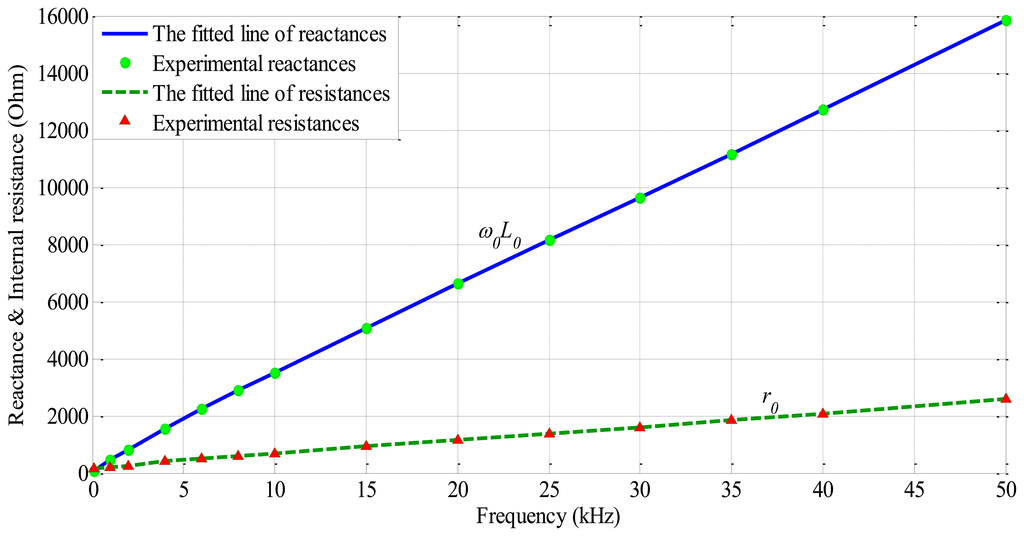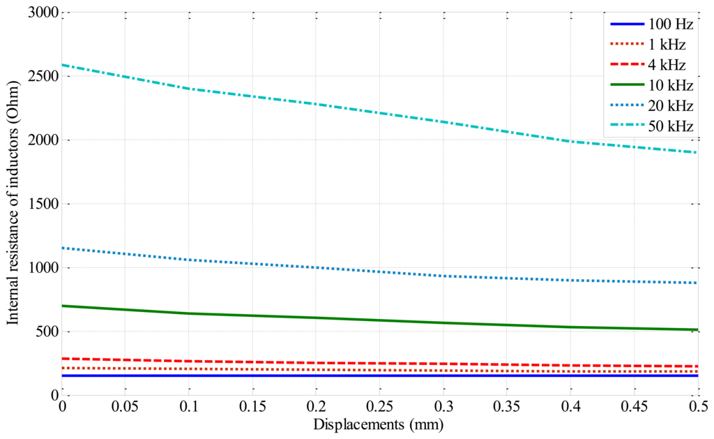A sensor measurement system based on a commercially available LCR meter and a test rig with high precision servo mechanisms, which is shown in Figure 4b, experiment sensor head with ferrite core, N = 1300, d = 2.5 mm, l = 4.5 mm, the frequency and displacement characteristics were measured in Figures 5, 6 and 7. In Figure 5, the internal resistance of sensor head is sufficiently small in comparison with its reactance.