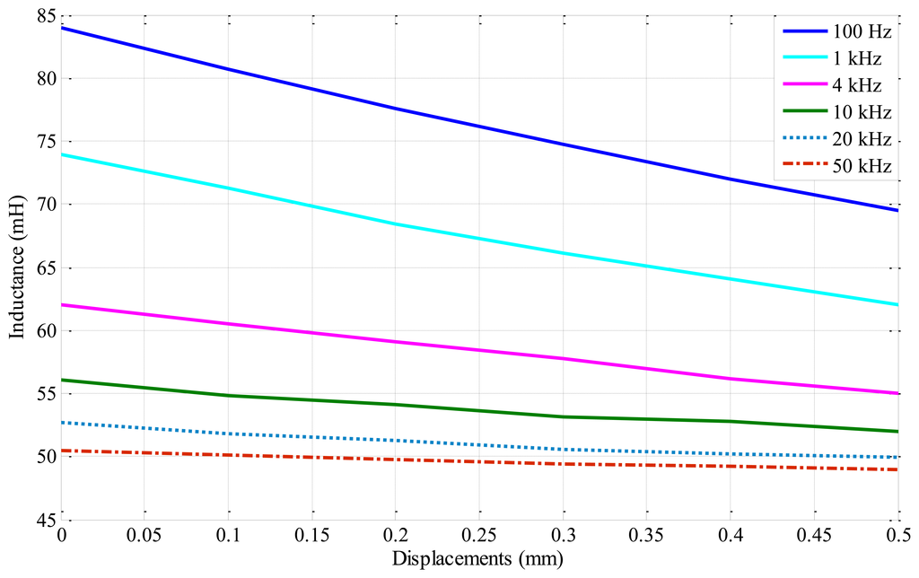 In Figure 6 illustrates that when increase exciting frequency excites to the inductance of sensor head in the range of displacement from 0 to 0.5 mm, the sensitive inductance decrease.