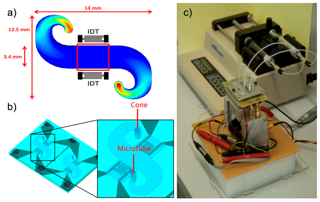 In order to achieve a uniform velocity of the sample in the path between the IDTs, Comsol software was used to simulate the flow of the liquid in a microchannel before the microfluidic system was developed (Figure 1a).