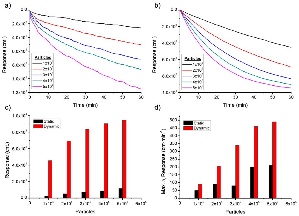 In static mode the movement of bioagents is only due to diffusion. With this slow process the bioagents do not quickly reach the antibodies. Nevertheless, with the dynamic mode the interaction between antibodies and biological warfare agents is promoted, improving the detection time and increasing the response of the sensor.