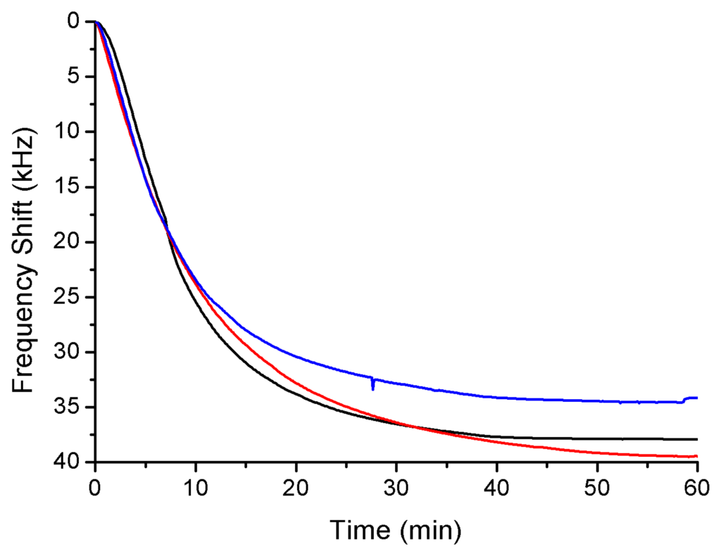 The Love device is a mass sensor; thus there is a correlation between the displacement of the resonance frequency and the amount of the bound antibodies, similar frequency shifts indicated a similar number of bound antibodies in the process of detection. Furthermore, there is a relationship between the number of bound antibodies and bioagents detected. In Figure 3, three responses to the GAR antibody are compared, obtaining a displacement of 37 ± 2.5 kHz. Due to the high reproducibility of the binding of antibodies, it was possible to compare different responses of the detection of each BWA simulant.