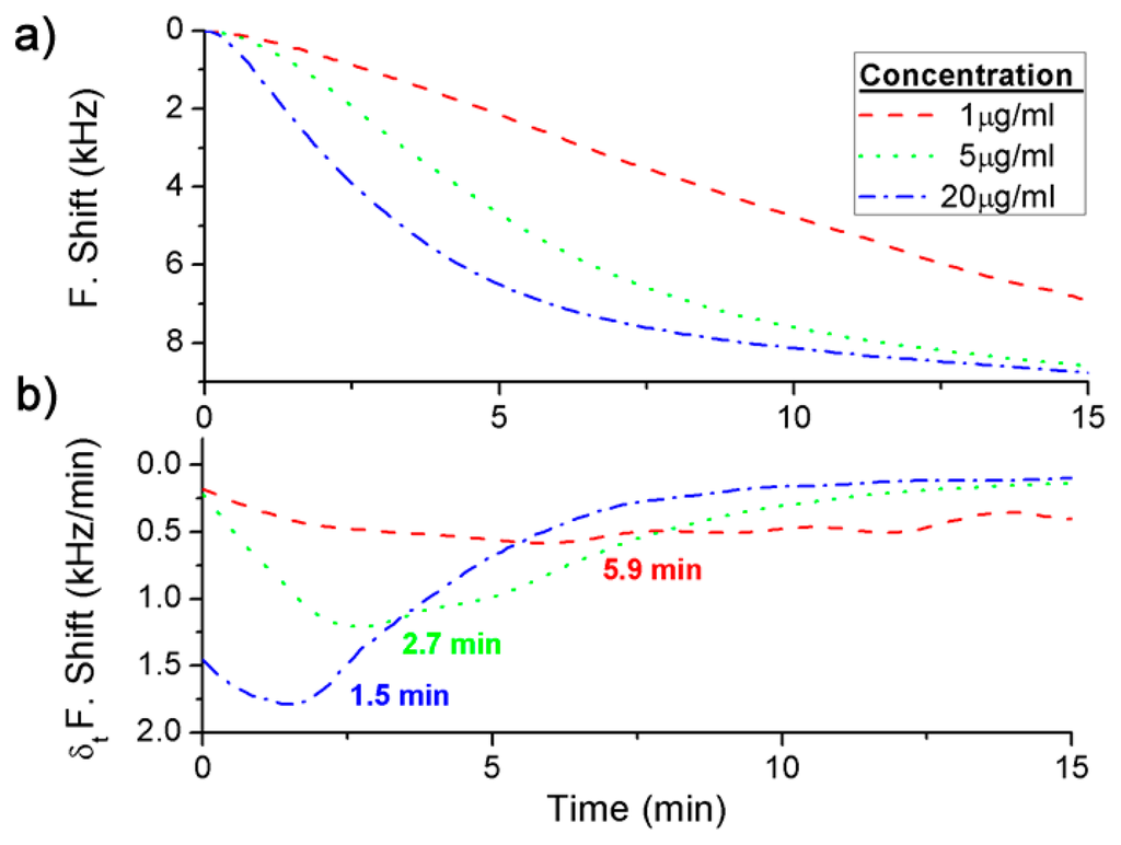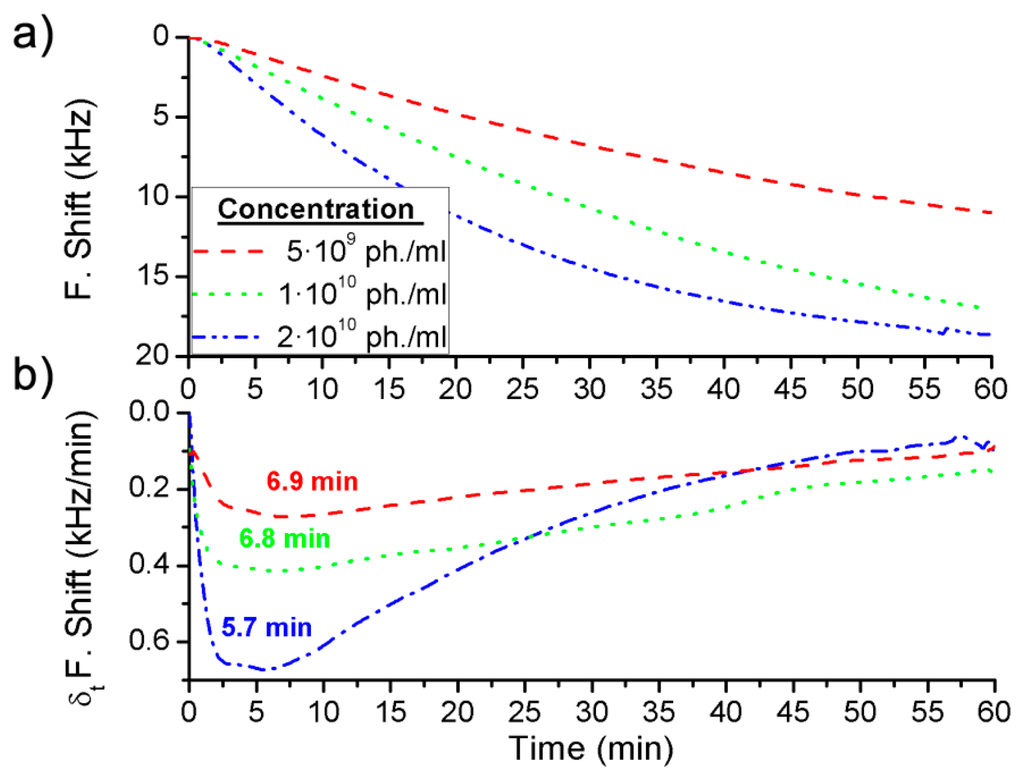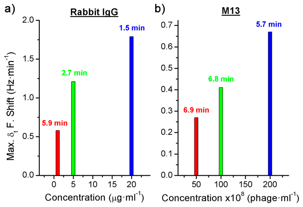 In addition, the derivate of the frequency with respect to the time was calculated and, as it has been explained above, the maximum value of the frequency shift per minute was used to quantify each concentration (Figures 4b and 5b). The difference between the real case and simulated case was that in the real case there was a delay until the maximum concentration of the bioagent reaches the sensor. Hence the maximum value of the frequency shift per minute was detected by the time derivative of the frequency shift. But this time was short and it was possible to quantify each concentration in a few minutes (Figure 6). On the other hand, Figure 4a shows the saturation was for around 9 kHz, and for the different concentrations of the Rabbit IgG, after 15 min of detecting, the immunoreactions were close to saturation. However, in static mode for lower concentrations (1 μg·mL−1 and 5 μg·mL−1) and after 1 h the sensor was not saturated [], therefore the immunoreactions were slower. In the case of the M13 for concentrations higher than 1010 pfu·mL−1 the immunoreaction is saturated after 1 h. Nevertheless Tamarin et al. [] carried out the detection of M13 in static mode and for higher concentrations than in this work, and after over 1 h of detecting that the immunoreaction was not saturated, it was evident that in dynamic mode the immunoreaction is faster.