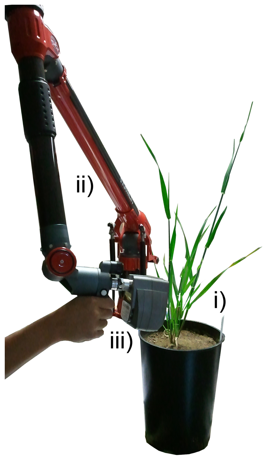For the data acquisition, a Perceptron V5 laser scanner (Perceptron Scan Works V5, Perceptron Inc., Plymouth, MI, USA) coupled to an articulated measuring arm (Romer Infinite 2.0, Hexagon Metrology Services Ltd., London, UK) was used. This combination offered a spherical measuring volume of 1.4 m in radius and a mean point to point distance of 14 μm [27]. The measurement accuracy was defined by the manufacturer as 45 μm [28]. Figure 2 shows the laser scanning device together with the coupled articulated measuring arm during a barley scanning experiment.