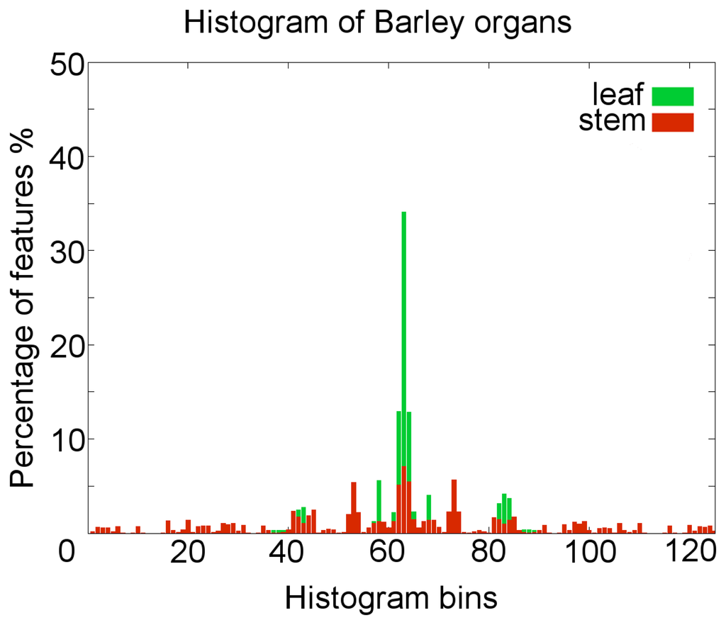 To evaluate our method, it was applied to an experiment with two barley plants, scanned on ten measuring dates during a period of 21 days. The histogram representation provided satisfying results and a clearly separable representation for the points of the barley organs, leaf and stem (Figure 3).