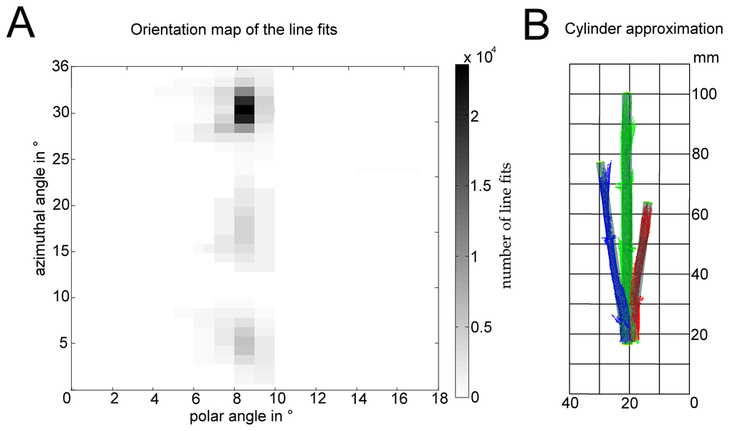 υ0 describes the initial residual vector (0, 0, 0)T that was updated iteratively. The equation system was solved using established procedures [37]. If all points were used, the cylinder approximately would result in a cylinder with a radius that is too big, due to the stem points that dispersed in the upper and lower end of the cluster. To overcome this physiological problem, the least-squares approximation was calculated using only six points. The robustness could be improved by using the RANSAC algorithm [38]. Thereby, the accurate separation of the points belonging to the different stems by the clustering algorithm reduced the required iterations to about 50. Finally, the result with the smallest discrepancy was chosen.