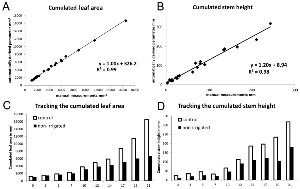 To evaluate the reliability of the automatically-derived parameters, they were compared to manually-taken parameters. Figure 6A shows a high correlation of R2 = 0.99 for the automatically-derived cumulated leaf area compared to the reference measurement. The cumulated leaf area of 20 datasets (two plants of ten measuring dates, irrigated and non-irrigated) was used. A root mean square error (RMSE) of 341 mm2 was reached.