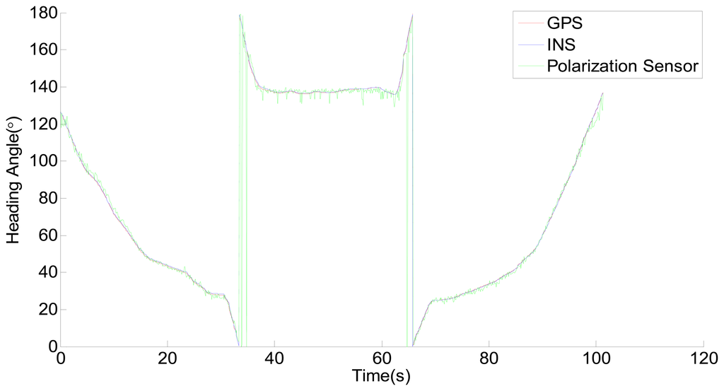 The raw data acquired from the three sensors is shown in Figure 9. The sampling period is 100 ms. In fact the sampling rate of the polarization sensor can reach up to 20 fps in the single-point measurement mode. In other words, an output data from the polarization sensor can be acquired in 50 ms. However, a sampling frequency of 10 fps is sufficient. The time and location of the measurements are always changing while the vehicle is moving, therefore, the measurement data of the sensor needs time and location compensation. According to the movement of the Sun, the polarization angle of the zenith will change as time goes on. Because of the movement of the vehicle, the position of the zenith also will change. The time compensation data can be obtained according to the time. The location compensation data can be obtained from the astronomical calendar according to the time and location. The output data shown in Figure 9 has been compensated with time. The process is simple. We increase 4.1667 × 10−4 degree per interval because the azimuth of the sun changes about 15° per hour. However, because the range of activity is limited and small, the influence of the movement of the vehicle could be negligible. In addition, because the output of the polarization sensor is in the range of 0° ∼ 180° and the output of GPS and INS are in the range of 0° ∼ 360°. To make it easier to see the relationship among GPS, INS and the polarization sensor, the output in the range of 180° ∼ 360° of GPS and INS is subdued 180°. From Figure 9, it is easy to see that the output of polarization sensor is significantly different with GPS and INS, however, there appears to be some relationship between them.