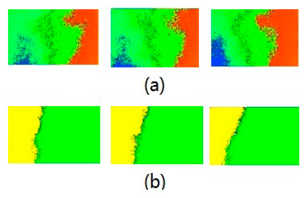 In the multi-point measurement mode, every pixel needs to be corrected by the same method described above. Since there are more data that need to be processed, the sampling rate only can reach 1 ∼5 fps. In multi-point measurement mode, another experiment of the sensor in the outdoor environment is performed. Under clear sky conditions, the sensor is used to get the skylight polarization distribution pattern. Figure 14 shows the output of the sensor in different times of a day, in which Figure a is the distribution of polarization degree, and Figure b is the distribution of polarization angle. Every color in these pseudo-color composite pictures is a value of the polarization information. Under clear sky conditions, according to the Rayleigh scattering model, the polarization degree is distributed in a banded pattern, and the polarization angle has an axially symmetric distribution. It is easy to know that the polarization distribution obtained through the sensor is in line with the theoretical distribution model from Figure 14. The interval time of the three pictures in one group was about 15 min. It is obvious that the polarization distribution pattern is changing as time goes on, but the change is not remarkable, and can be compensated with the external information, for example, time, location, etc.