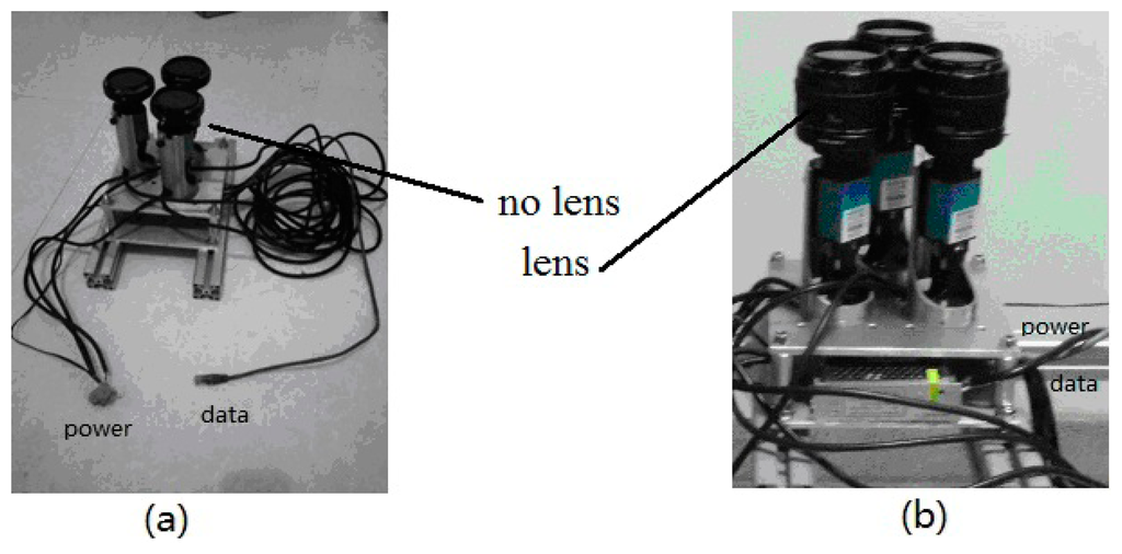 The sensor consists of three modules: the polarized light detection module, the power module and the data communication module, as shown in Figure 2. The power module includes a transformer and a regulator. The data communication module includes a Gigabit Ethernet switch and a few network cables. The polarized light detection module includes three cameras and three linear polarizers. When the lenses are not installed, the sensor works in the single-point measurement mode, as shown in Figure 2a. When the lenses (focal length, 28 mm) are installed, the sensor works in the multi-point measurement mode, as shown in Figure 2b. Of course, under some weather conditions the sensor needs to be installed a blue filter on the top of the three polarizers to make the output of the sensor more stable and accurate.
