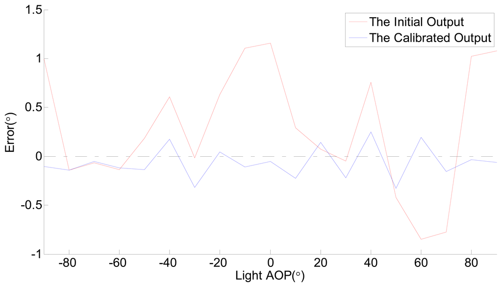 Secondly, the nonlinear error of the sensor also needs to be reduced. We rotate the rotary table from −90° to 90° to rotate the polarity direction of the polarized light from −90° to 90°. In this process, the output data of the sensor are collected once every 10°. The output data of the sensor has been filtered as described in Section 2.3 (Step 3). The error of the initial data in the experiment is shown in Figure 6. The most striking observation from Figure 6 is that the effect of the filtering is outstanding. The max measurement error of the AOP (angle of polarization) is 1.1556°. The results indicate that there are some slight errors which are described in Section 2.3 (Step 5). For this reason it is difficult to ensure the accuracy of the initial output data from this sensor. In order to obtain a higher accuracy, the sensor needs to be calibrated. As described in Section 2.3 (Step 5), a Fourier formula is used to fit in with the characteristic curve of the sensor. According to the result of the unprocessed output data of the sensor and the data of the polarized light, the parameters of Equation (3) are shown in Table 1.