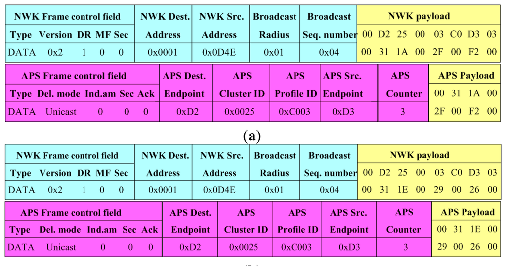 Through a tool called Packet Sniffer running on the PC, some data frames were captured during communication. Figure 5 shows part of data frames about the routing node 0X0001 communicating with its three children sensor nodes 0X0D4E, 0X0D4F and 0X0D50, where, the sensor nodes 0X0D4E, 0X0D4F belonged to type (I), while the sensor node 0X0D50 belonged to type (II). By analysis of the data frames, information such as frame type, source address, destination address and application layer data could be parsed easily.