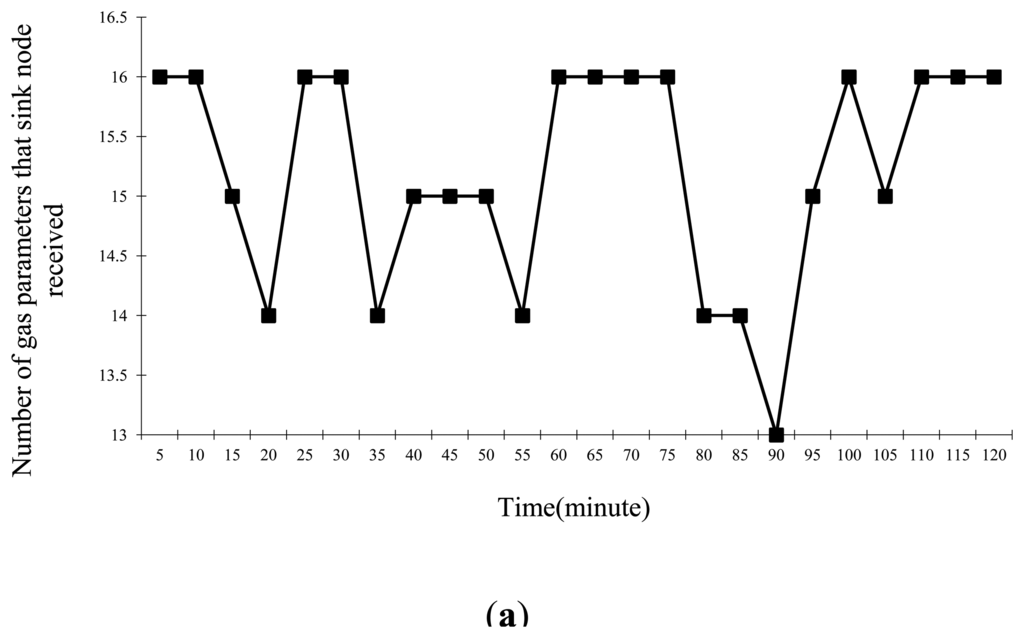 As plotted in this figure, we can see that the sink node received parameters from most of sensor nodes every 5 min, meaning the periodic inspection function is stable; Meanwhile, it received some parameters from a few sensor nodes, their Limit field was 0X01 by parsing these frames, that is, they were overrun parameters, so the interrupt service function is stable. We note that the sink node did not receive parameters from all sensor nodes in some periods. Nevertheless, the number was relatively small so that we have reason to consider that the WSN works stably.