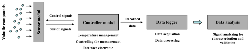 The sensor unit is followed by a control unit responsible for controlling the temperature of the sensor heating system and for handling the data recording and data storage. Finally, a data logger collects the sensor data (sensor curves) and specific patient data; this logger contains also a reference data base for specific sensor curves (not used in this study). Data preprocessing and analysis can be performed either on the data logger or on a separate computer.